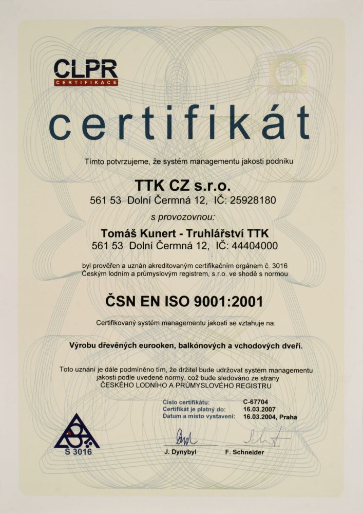 Certifikát TTK ALU PLUS