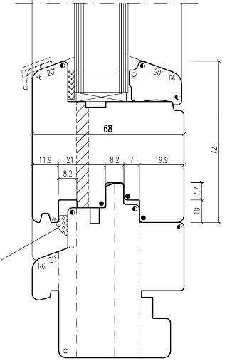 Okenní systém 12.25 Eurofalz pro okapnici DRAU 25. Shodné dělení čepů v křídle a v rámu pro kombinaci otvíravého a pevného zasklení. Naléhávka křídla tl. 16,5 mm pro 2.těsnění. Odvodňovací drážka po celém obvodu křídla. Zasklení o hloubce 18 mm sklon 20° zachovaný i na rámu. Zasklívací lišta se zafrézováním dosedací plochy.